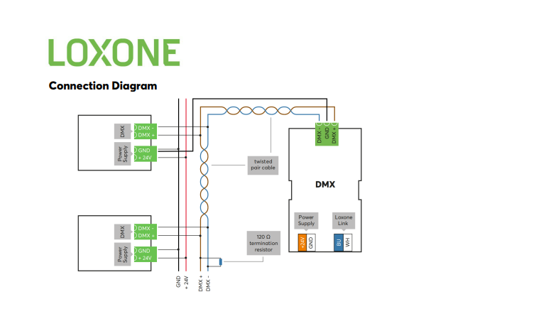 Extensia DMX permite conectarea sistemului Loxone la protocolul de iluminat DMX (Digital Multiplex Protocol). Acest protocol se utilizează pentru crearea jocurilor de lumini și scenariilor pentru spectacole sau iluminatul arhitectural. Cu ajutorul acestei extensii, putem crea efecte de iluminare spectaculare și scenarii complexe pentru diverse evenimente sau proiecte arhitecturale. Multe corpuri de iluminat arhitectural au protocolul DMX, permițând utilizatorilor să creeze scenarii de iluminat creative și colorate pentru fațade sau alte zone speciale.