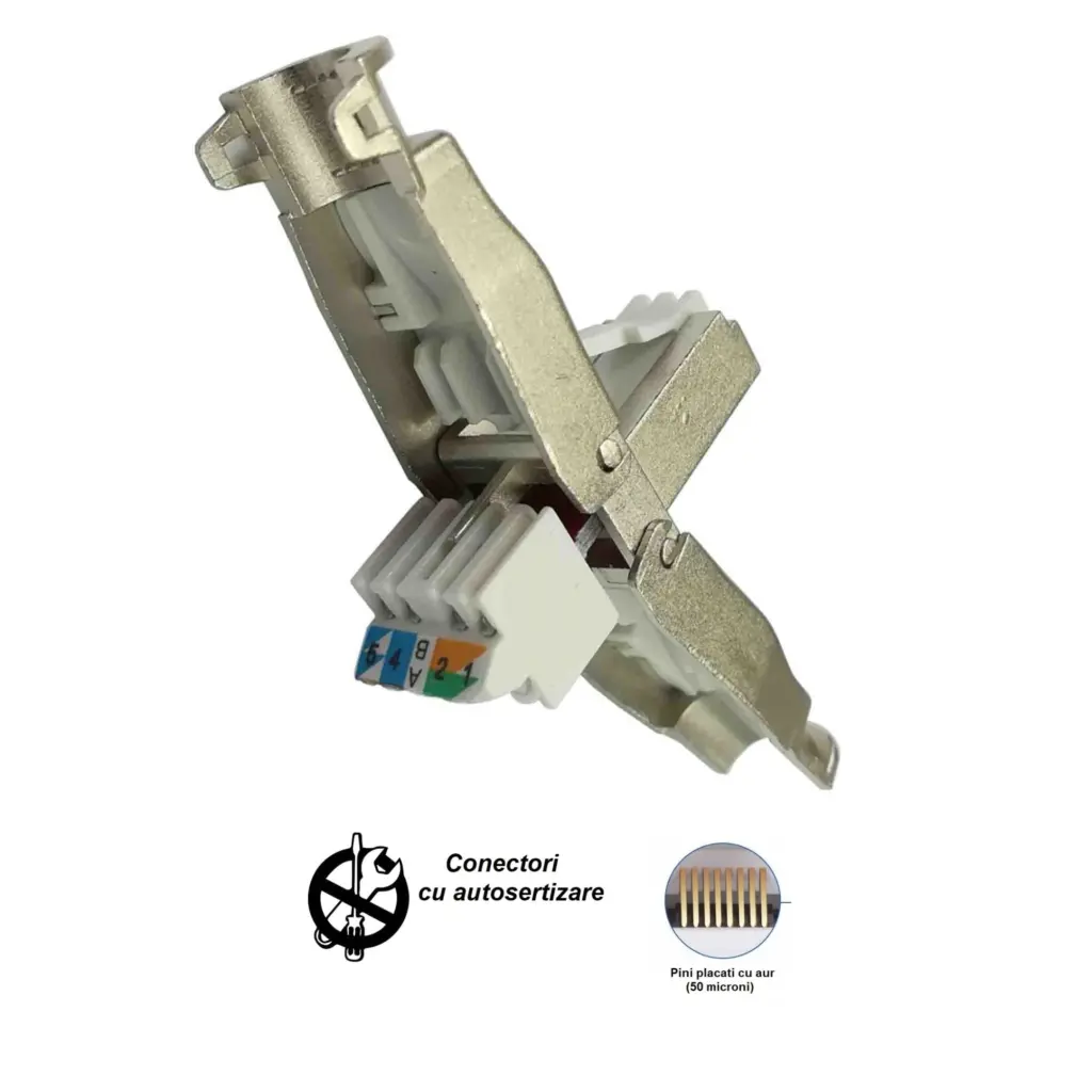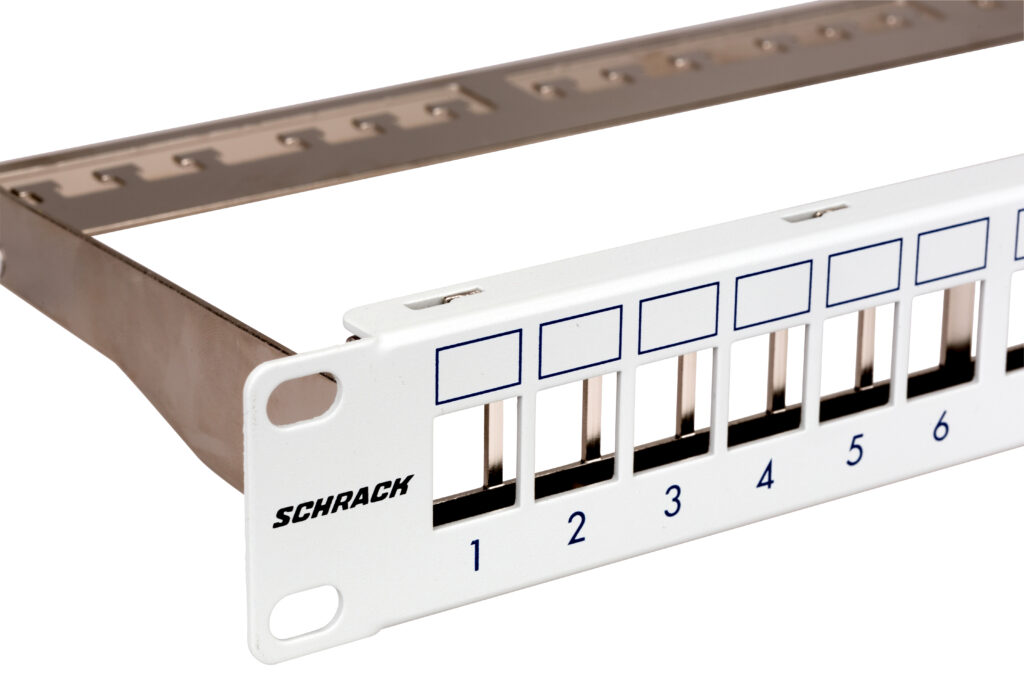 După instalarea rack-ului și trecerea cablurilor de rețea în interiorul său, organizarea acestora devine esențială. Utilizăm tehnologia Toolless de la Schrack, care înlocuiește patchpanelul clasic cu un suport pentru mufe Toolless.