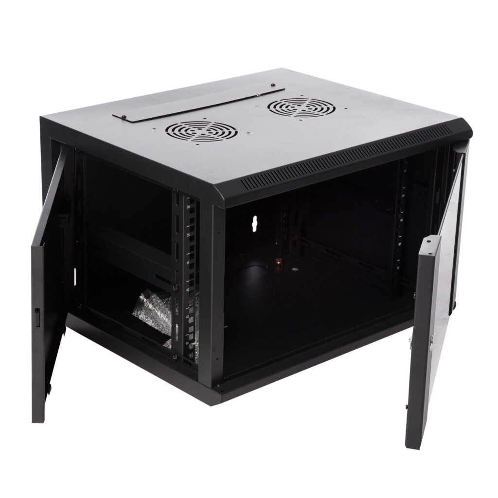 Un aspect esențial în configurarea rack-ului îl reprezintă alegerea dimensiunilor adecvate, în funcție de complexitatea proiectului de curenti slabi. În general, utilizăm rack-uri montate pe perete, cu o lățime standard de 19 inch pentru instalarea echipamentelor rackabile. Înălțimea și adâncimea acestor rack-uri variază în funcție de necesități. De exemplu, pentru un apartament, un rack cu adâncimea de 45cm și înălțimea de 9 unități (U) este o opțiune potrivită. Fiecare unitate are o înălțime de 1,75 inch și este echipată cu 3 găuri sau prinderi pentru susținerea echipamentelor.